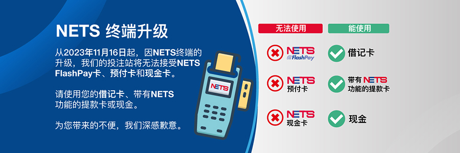 从2023年11月16日起,因NETS终端机的升级,我们的投注站将无法接受NETS FlashPay卡、预付卡和现金卡。